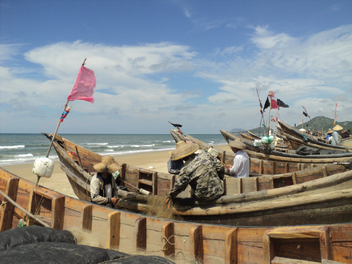 电白原海滩,是一片还没开发的沙滩,每天有渔民在海上作业。